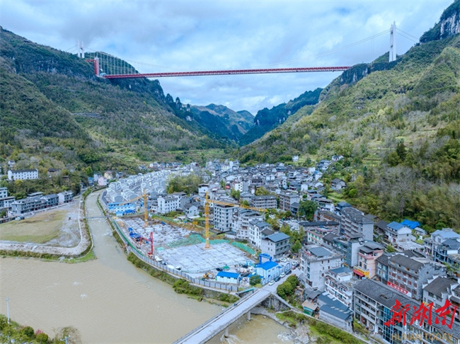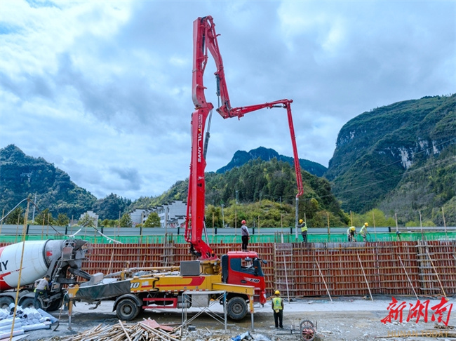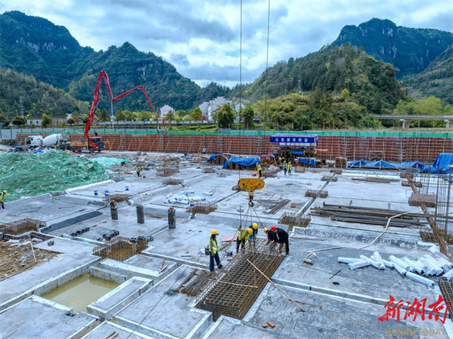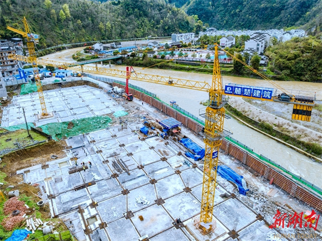 The photo shows workers taking advantage of the fine weather to accelerate construction at the construction site for the project of a farmers' market and its supporting infrastructure in the Daxingzhai Reservoir Resettlement Area of Jishou City. Upon completion, the project will effectively improve the quality of life for resettled and local residents, strengthen the competitiveness of the agricultural products market, and inject new momentum into regional economic development. (Photo/Peng Jing)