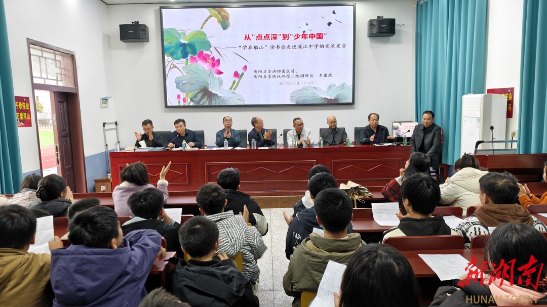 新湖南客户端3月29日讯(通讯员 邹红辉 陈曙霞)三月的岳沙河畔,油菜摇曳,春意盎然。3月26日下午,由中共衡阳县委宣传部指导、衡阳县档案馆主办、湖南王船山故里研学实践教育基地执行的“船山遗韵·少年传承”主题研学进校园活动,在溪江乡中学温情启幕。船山研学讲师团为全校师生送上了三堂别开生面的船山国学文化课,让这位明清之际伟大思想家的智慧之光,照亮乡村少年的心田。