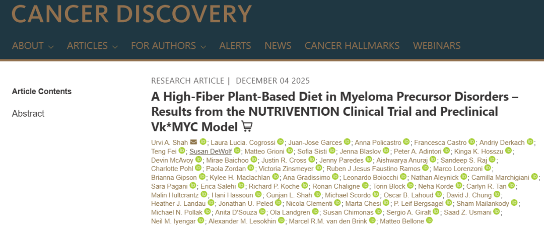 2025年发表在国际期刊《癌症发现》(Cancer Discovery)的研究显示,坚持吃富含纤维的植物性饮食,可以显著改善菌群、代谢和免疫,延缓骨髓瘤前体疾病进展,也就是阻止癌前病变发展成癌症。