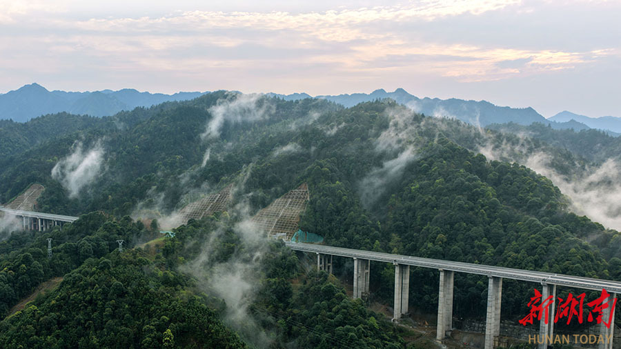 3月29日傍晚,城步苗族自治县汀坪溪特大桥周边呈现雨后美景。云雾缭绕中,高速公路与晚霞辉映,勾勒出壮美的山水画卷。 严钦龙 摄(湖南图片库)