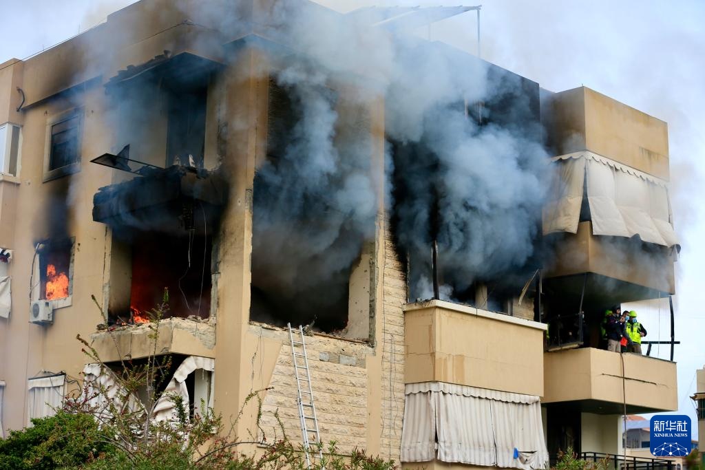 3月14日,在黎巴嫩哈雷特赛义达,人们在以军无人机袭击现场灭火。