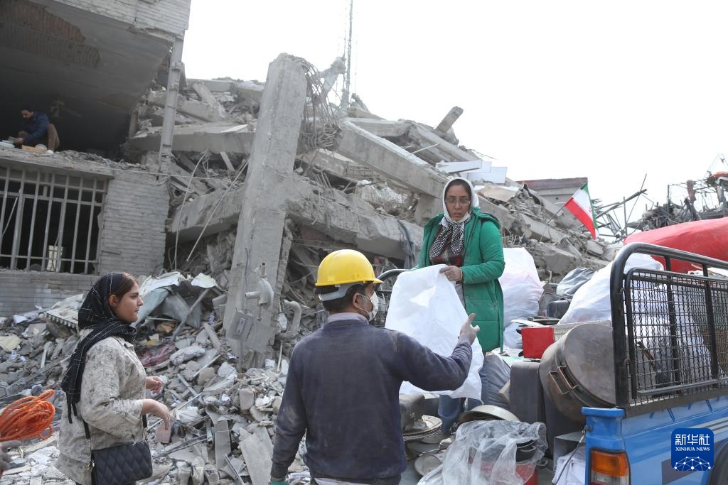 3月12日,在伊朗德黑兰,市民站在建筑废墟前。