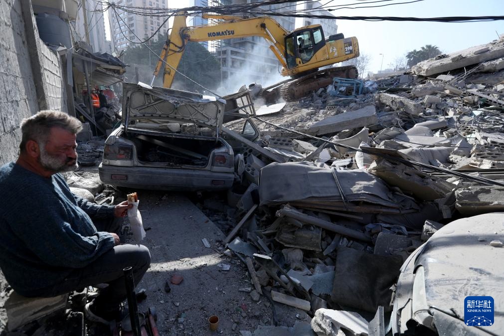 3月18日,在黎巴嫩贝鲁特,一名男子坐在被以色列空袭损毁的建筑前。