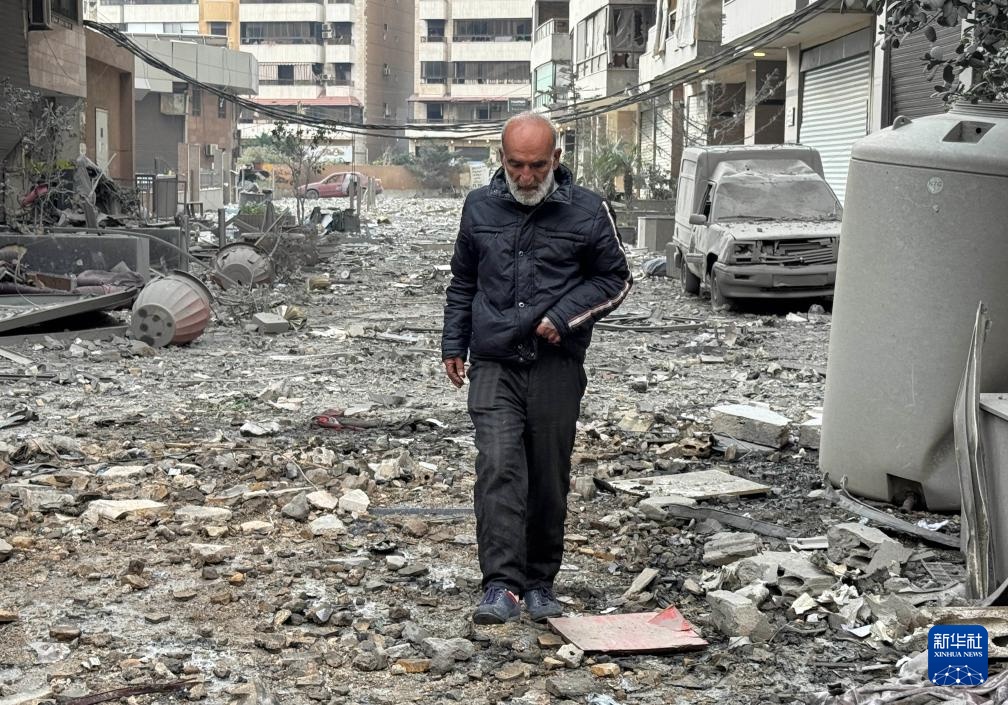 3月7日,在黎巴嫩贝鲁特南郊,一名男子走在被以色列袭击后的街道上。