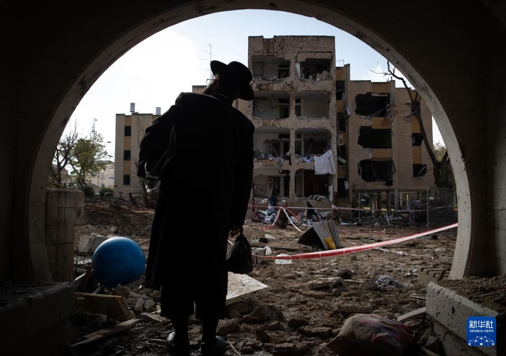 3月22日,在以色列阿拉德,当地居民查看在导弹袭击中受损的建筑。以南部城市迪莫纳和阿拉德3月21日晚遭伊朗导弹击中。