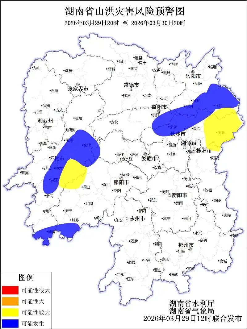 根据省气象局3月29日预报,省水利厅与省气象局联合会商得出如下结论:受降雨影响,29日20:00至30日20:00,岳阳市、怀化市、长沙市、株洲市、邵阳市、湘潭市、益阳市、娄底市等局地可能发生山洪灾害。