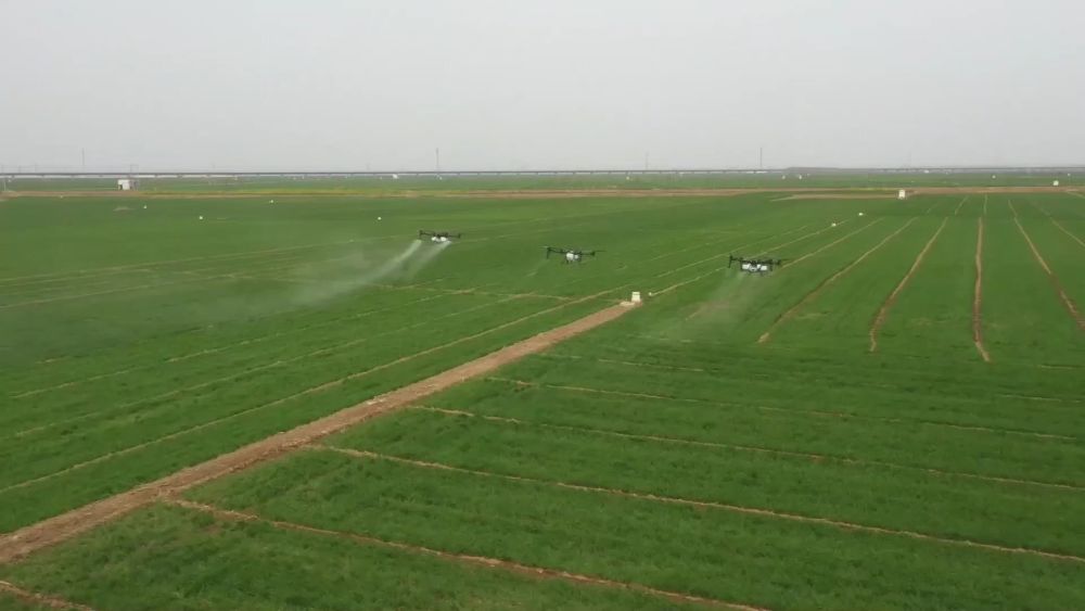 在河南省商丘市梁园区刘口镇,一望无际的麦田长势喜人。在农技专家的指导下,当地正在为小麦进行大规模无人机飞防作业。