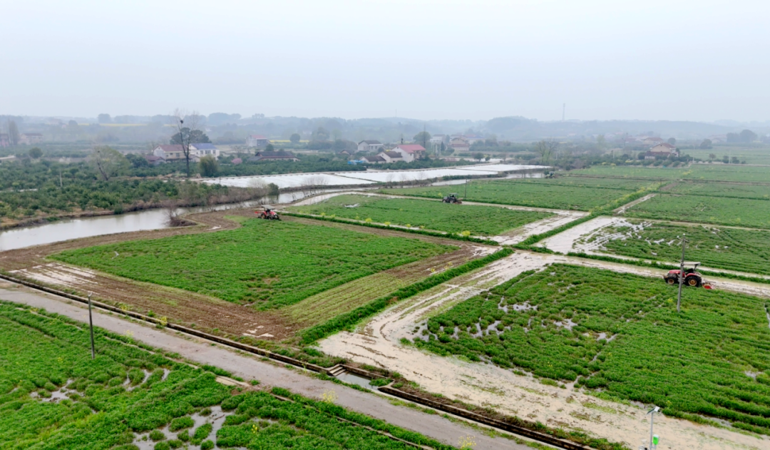 伴随着隆隆的机械轰鸣,数台大型旋耕机正在田间来回穿梭,将茂盛的紫云英翻压入土。