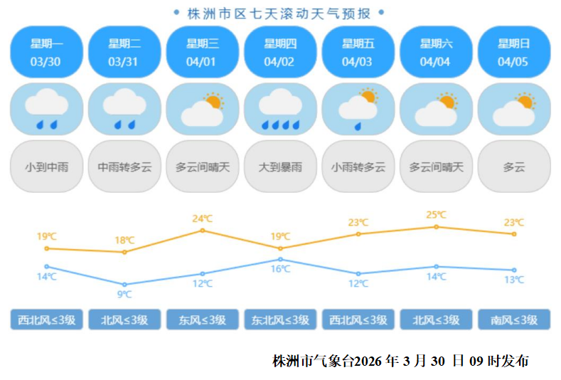 3月30日,小到中雨,茶陵、炎陵局地大雨,气温14~