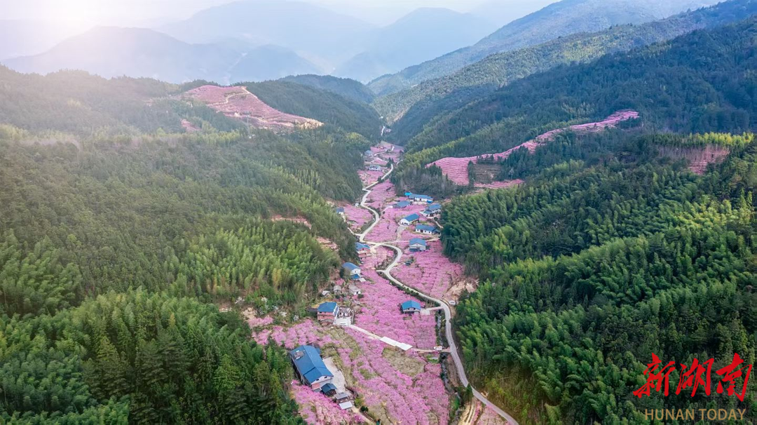 三月的风,驱散了春寒的凛冽,携着温柔的暖意,吹醒了沉睡的大地,也吹开了漫山遍野的桃花。每年这个时候,罗霄山脉深处的炎陵都以10万亩盛开的桃花为春天做最生动的注解。“人间四月芳菲尽,山寺桃花始盛开”,往年山下的花已凋谢,山上的花才绽放,今年赶巧了,炎陵高山的桃花在暖冬的温柔乡里竟然早早地苏醒,打破常规的先开出了花。从山的尽头如潮汛一样,徐徐翻卷而来,直至山脚,自上而下,漫天的粉云,把远近的山都浸成了朦胧的粉色轮廓。