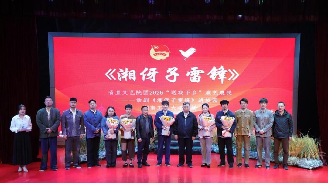 湖南日报·新湖南客户端3月30日讯(通讯员 孙世伟 胡杨扬 潘桉莘 朱保澄)三月春风育桃李,雷锋精神润芳华。为深入弘扬新时代雷锋精神,涵养青年学子家国情怀,省直文艺院团2026年“送戏下乡”演艺惠民——话剧《湘伢子雷锋》进校园湖南工业大学专场于3月24日下午在音乐与舞蹈学院音乐厅倾情上演。演出以舞台为载体、以精神为内核,将艺术演绎与思政教育深度融合,为湖南工业大学师生献上了一场思想深刻、情感真挚的文化盛宴。党委书记刘望出席活动,与300余名师生一同走进雷锋故事,沉浸式感悟雷锋精神。