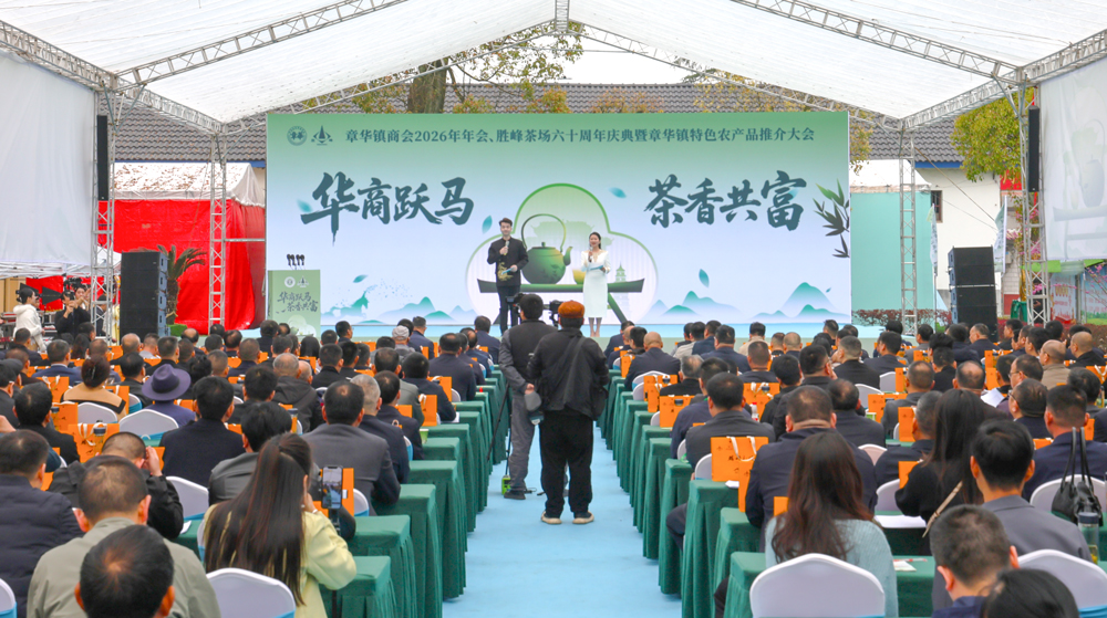 湖南日报·新湖南客户端(记者 刘神尊 周佳欢 刘思昊)春山叠翠,茶香满园。3月29日,华容县章华镇胜峰茶场千亩茶园吐绿纳新,章华镇商会2026年年会、胜峰茶场六十周年庆典暨特色农产品推介大会在此举办。县领导张岳平、刘绍文、陈飞、毛文楷、易湘禹、朱先涛,乡友代表、商会会员等齐聚一堂,以茶为媒,共话发展。