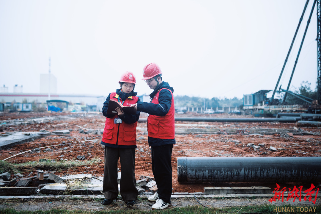 供电公司工作人员在永杉锂业三期施工现场了解工程进度,检查电缆沟是否按图施工。陈佳杰 摄