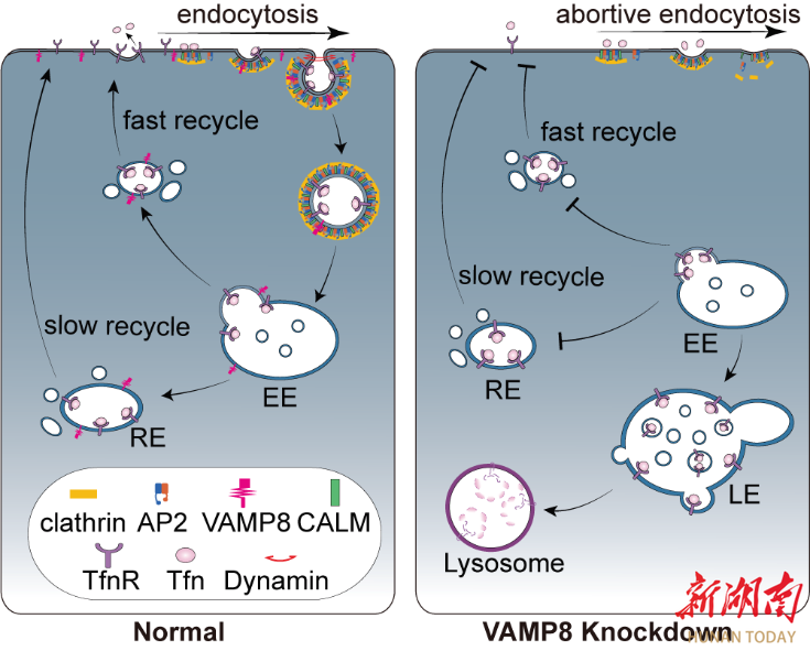 囊泡相关膜蛋白8(Vesicle-Associated Membrane Protein 8,VAMP8)具有调控胞内囊泡循环运输的功能,然而VAMP8所介导的胞内囊泡运输是否参与调控CME过程尚不清晰。陈志明教授团队针对这一关键科学问题开展深入研究,发现VAMP8在调控CCP起始、稳定及内凹中发挥重要功能。进一步机制研究显示,VAMP8并非通过直接被招募到CCV来调控CME,而是通过促进内吞货物(如转铁蛋白受体)在胞内体与质膜之间的循环间接影响CME。