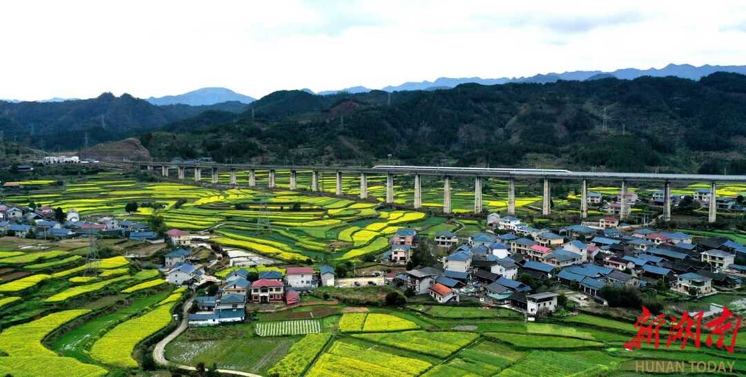 阳春三月,沪昆高铁列车穿行于怀化中方县新建镇的油菜花海,金色花海与疾驰的“银色巨龙”交相辉映,构成一幅动感十足的春日画卷。(袁廷轩 摄影报道)