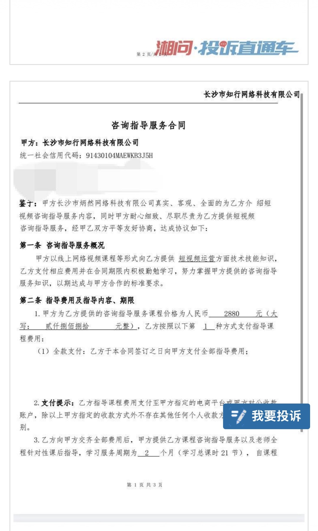 缴费后他才发现,合同是“咨询服务合同”,甲方为“长沙市知行视界网络科技有限公司”,合同里还冒出另一家公司。“这不就是套用各种马甲规避责任吗?”小周当场要求退款,对方劝他“7天内可退”。他进了学习群,两天后正式提出退学,老师先是拖延,后来干脆不理。小周拨打12315投诉后,对方回复:扣除课时加违约金,只能退1300多元。