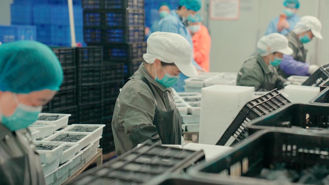 生产车间内,工人们正专注地对臭豆腐坯进行人工挑拣。