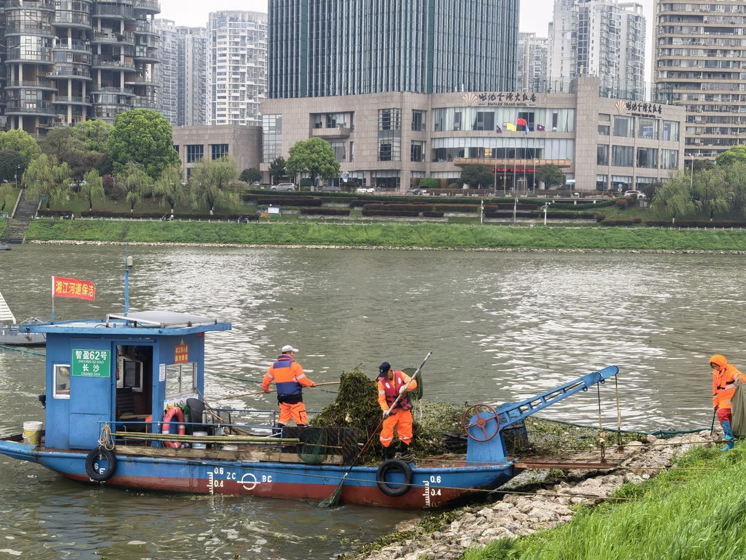 受今年水葫芦暴发、上游支流裹挟塑料垃圾及杂物等影响,湘江长沙段生态保洁压力加大。从天心区暮云街道暮云新村至望城区茶亭镇苏蓼村,打捞船只昼夜奋战,对78.5 公里岸线水域开展全覆盖、无死角清理,全力守护一江碧水。