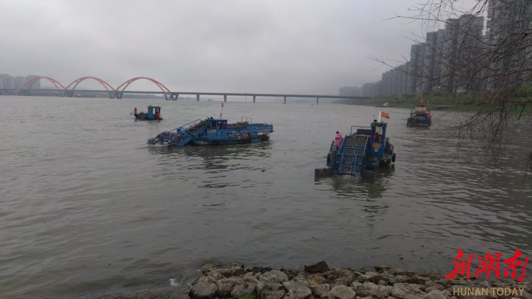 据长沙智盈环境卫生管理有限公司现场负责人刘洋介绍,近岸区域垃圾及水葫芦淤积较快,部分小船半小时即可装满打捞物资,大家坚守岗位、高效作业,用汗水守护江面洁净。