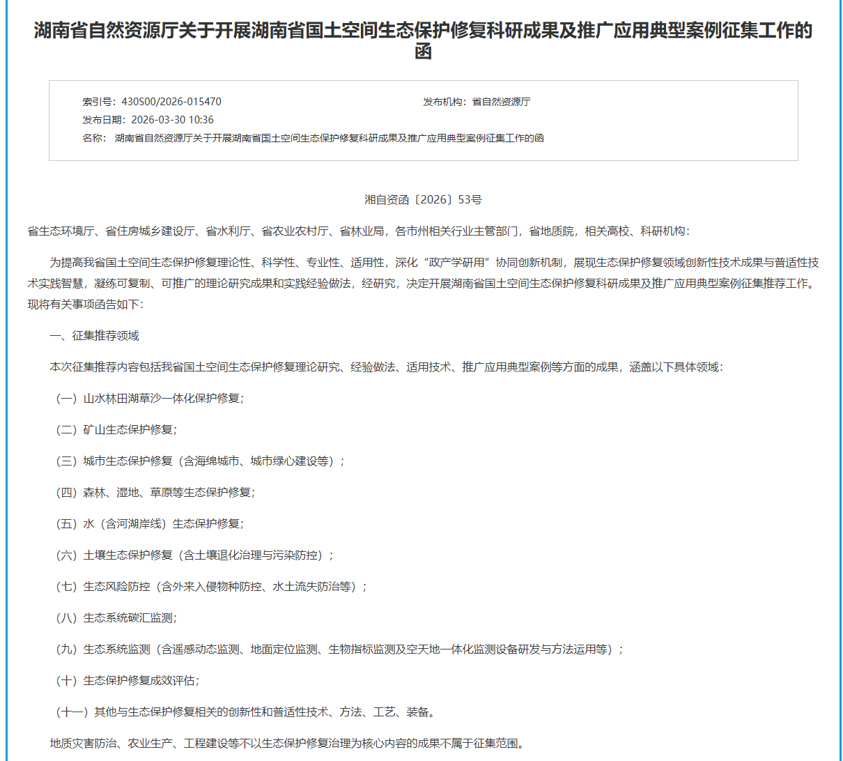 申报链接:湖南省自然资源厅关于开展湖南省国土空间生态保护修复科研成果及推广应用典型案例征集工作的函