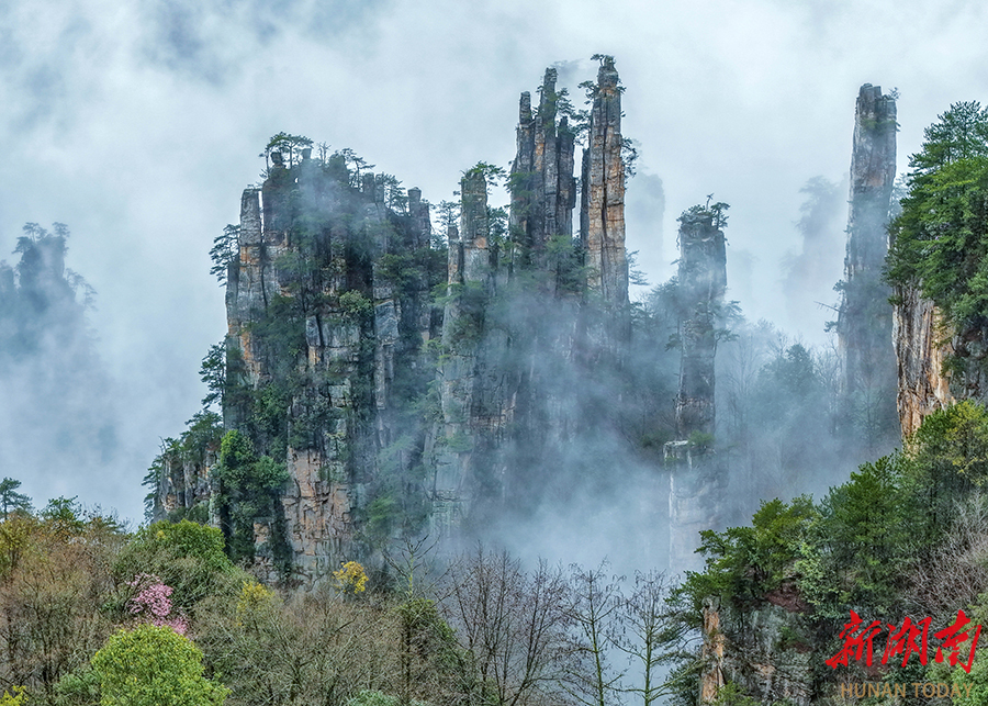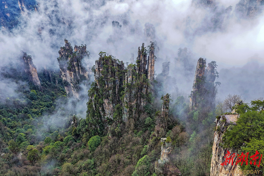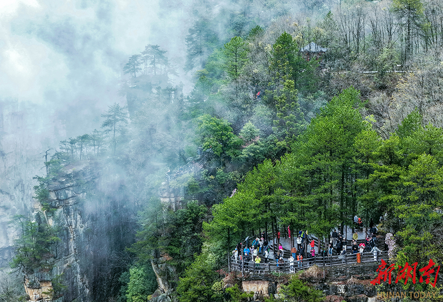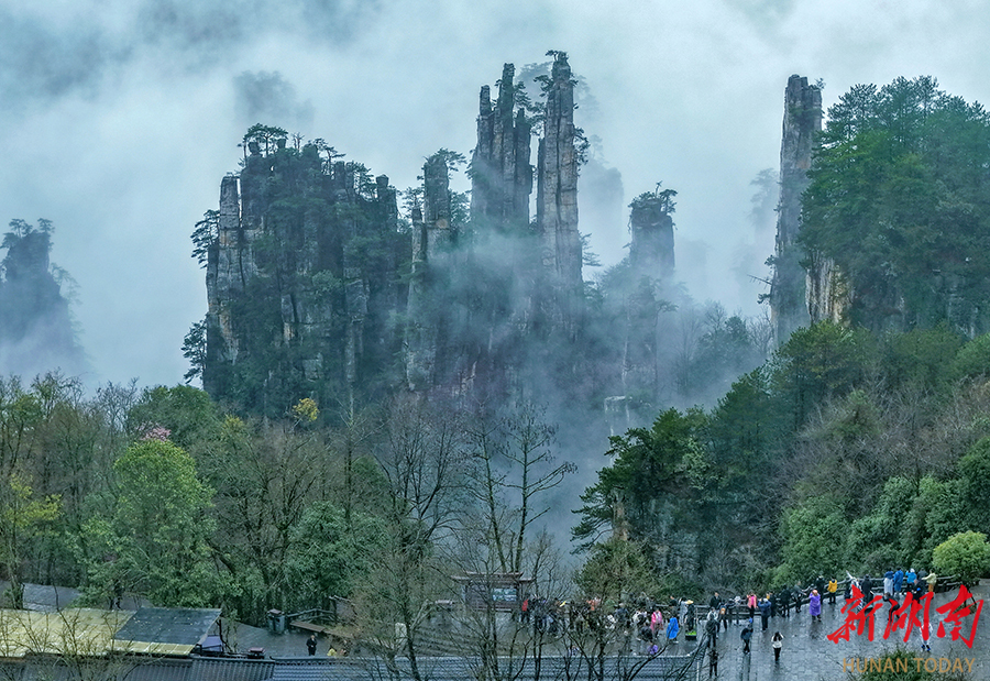 3月30日,张家界国家森林公园天子山景区出现云海奇观。连绵春雨中,三千奇峰被缥缈云雾环绕,宛若水墨丹青,吸引众多游客前来观赏这奇特的自然盛景。 吴勇兵 廖颂怡 摄影报道(湖南图片库)