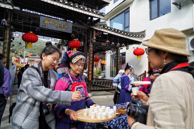 贵阳龙井布依古寨拦门酒。浓郁的少数民族特色深受境外游客喜爱。