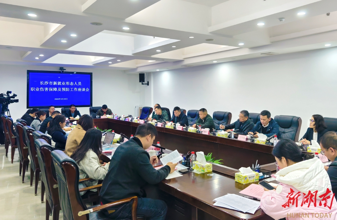 在主题座谈会上,长沙市委社会工作部、市邮政管理局相关负责人,中国工伤保险专家团队,以及淘宝闪购、美团、京东、曹操出行等10余家新业态平台企业代表齐聚一堂,观看职业伤害预防宣教片,解读相关政策,共商新业态劳动者权益保障机制。