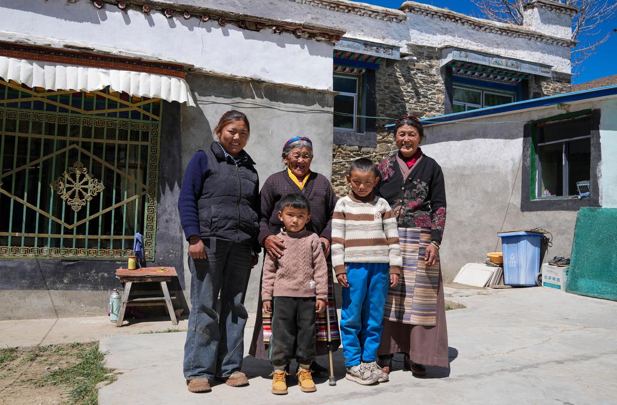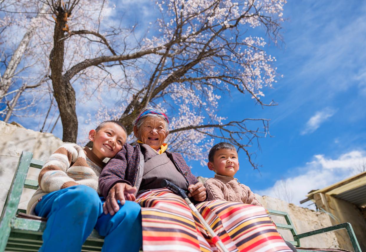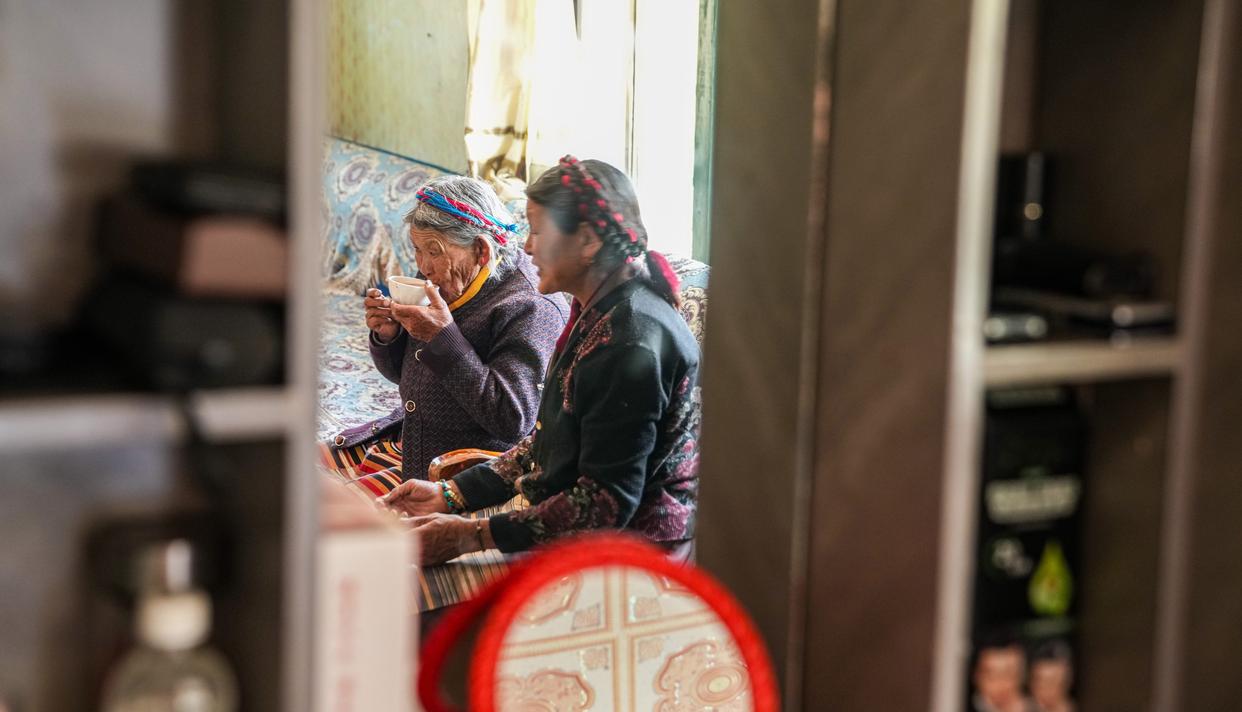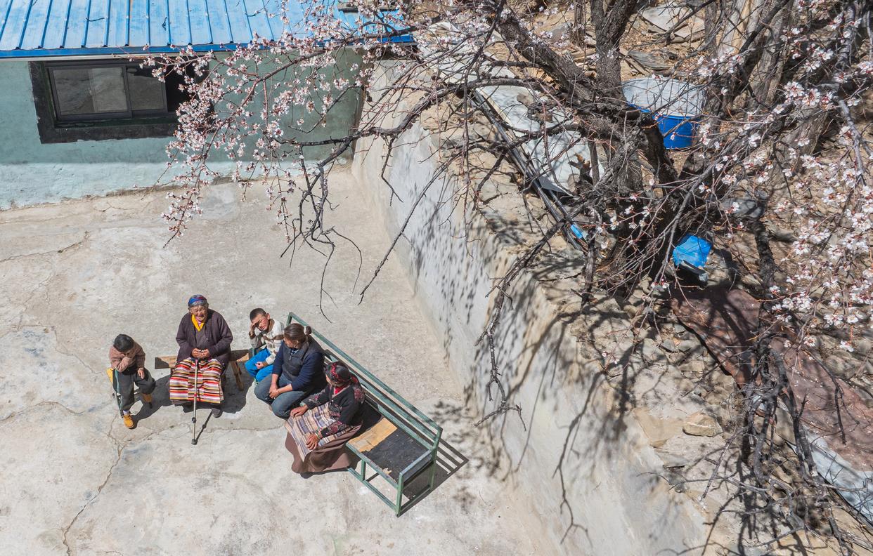 3月26日,次仁桑姆(左二)和晚辈在宗卡村家中的院子里聊天(无人机照片)。镜头下老人的笑容里眼角的皱纹中都盛满了幸福与满足那是岁月馈赠的安稳是政策带来的福祉更是亲情温暖的模样