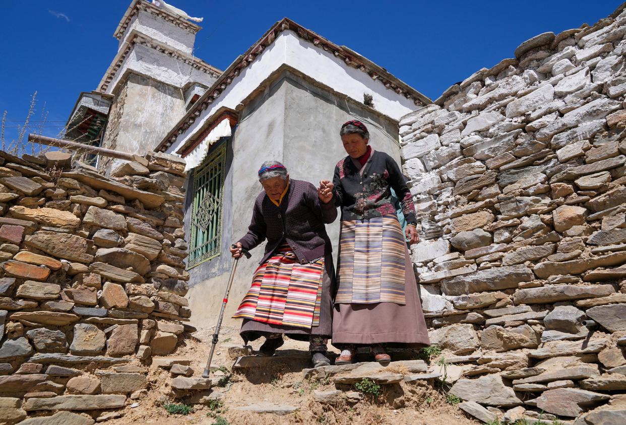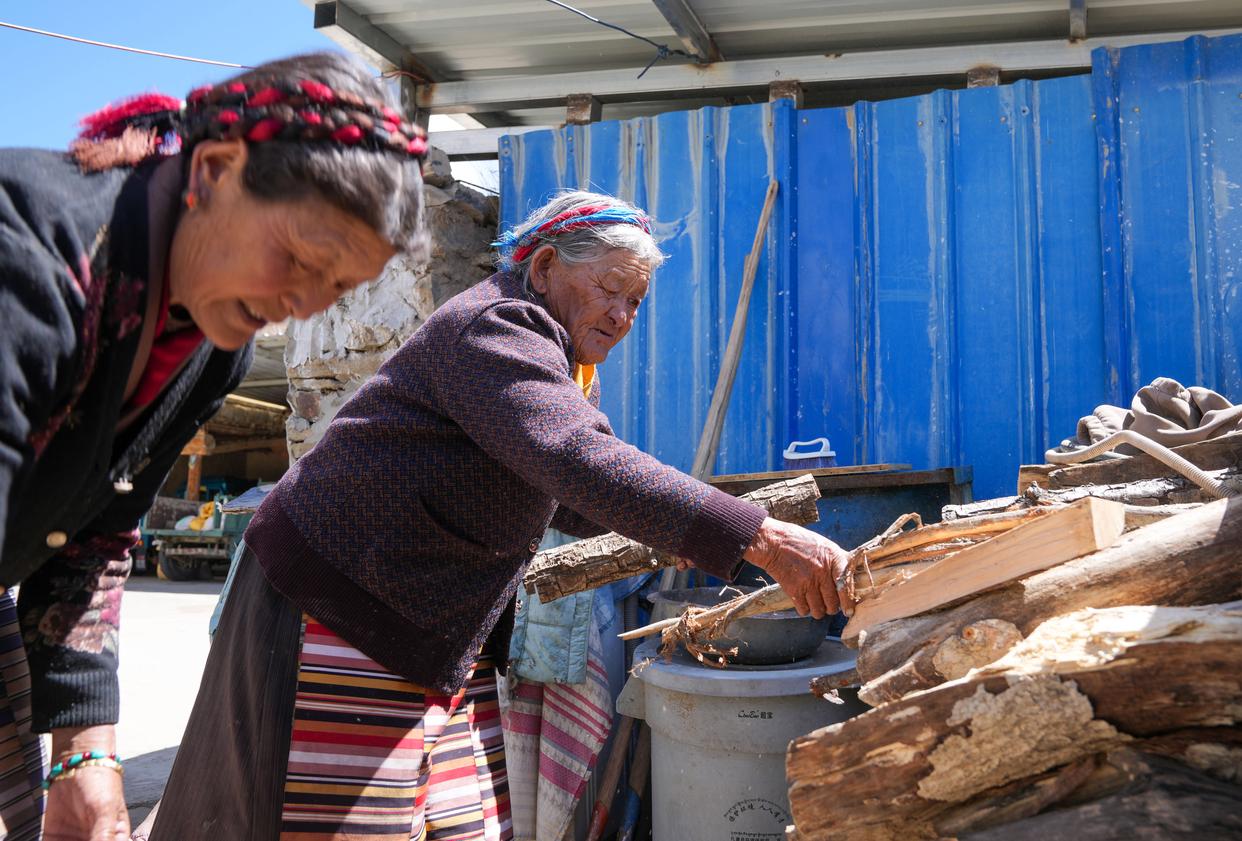 次仁桑姆(右)和女儿在整理家里的木材堆(3月26日摄)。更让老人欣慰的是儿孙们孝顺又懂事老人有2个孩子、9个孙辈再加上10个曾孙辈每逢过年儿孙们便会欢聚在她身旁给她献上洁白的哈达送上真挚的祝福用最朴素的方式表达对老人的敬爱与关怀