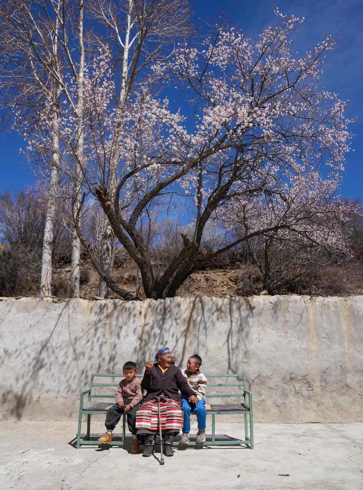 次仁桑姆(中)和两位晚辈在宗卡村家中的院子里聊天(3月26日摄)。只有经历寒冬的人才知道春天的温暖如今西藏的翻身农奴早已过上了祖辈们梦寐以求的幸福生活