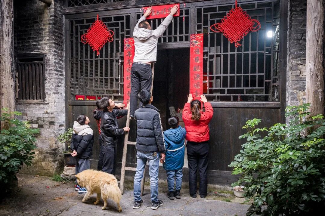 《红联映古宅》古宅门前,全家老小齐上阵贴春联。红绸结高悬,黄犬踱步,老少同心的忙碌瞬间,将传统年俗与阖家温情,深深镌刻在老宅的肌理之中。