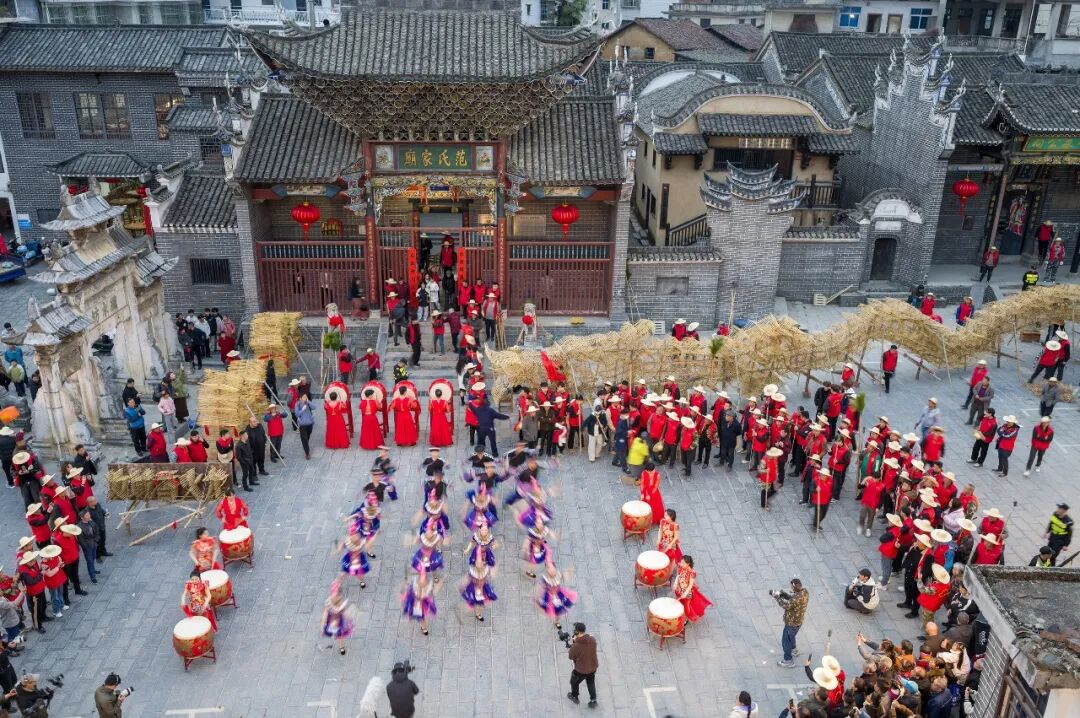 《古村闹春》范氏家庙前,古村广场上演民俗盛会,彩衣舞动、锣鼓铿锵,稻草龙阵环列,满是新春的红火与传承的温度。