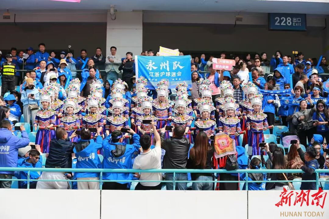 在苏永城市友谊赛中,同学们身着精美旗袍与瑶族服饰,伴着婉转的《刘海砍樵》、《千年等一回》等旋律与明快的长鼓节奏翩然起舞,既为永州与江苏两地球队加油鼓劲,又以文化交流传递“苏永一家亲”的深厚情谊,让在场江苏友人沉浸式感受潇湘文化的独特风采。