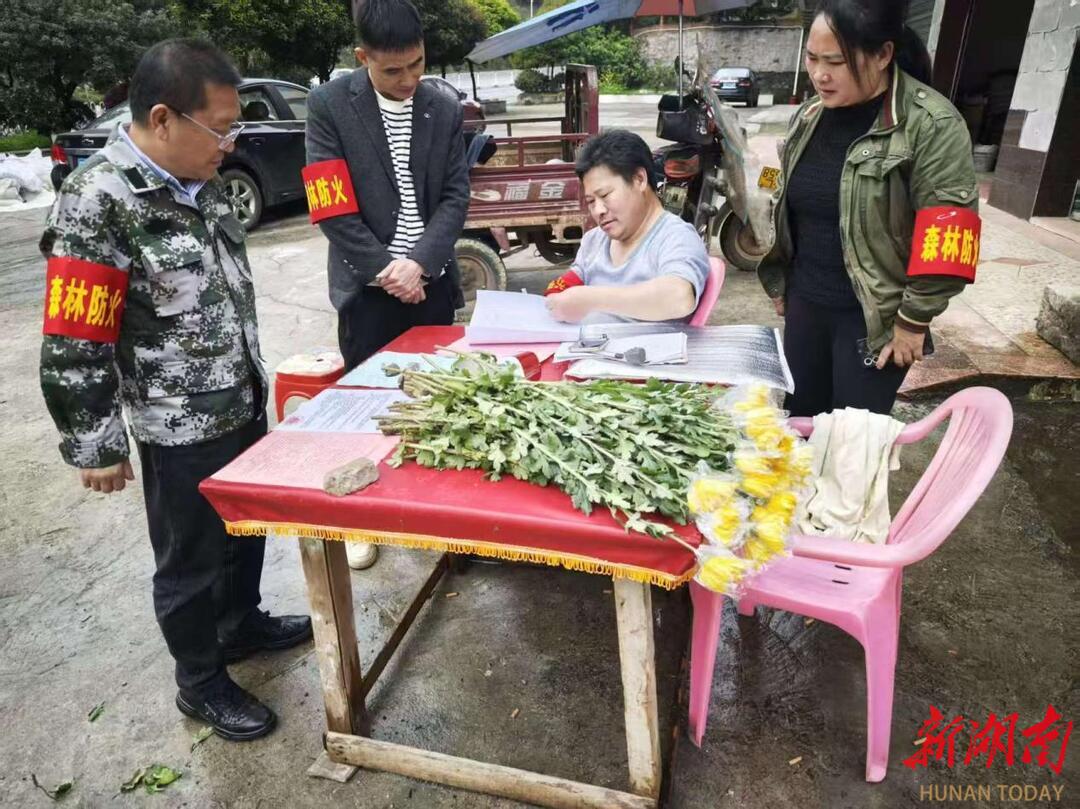 活动当天,行廊镇在各村进山扫墓的主要路口设立了宣传值守点。由镇村干部、党员志愿者和护林员组成的工作队全天候值守,现场不仅准备了1000余枝鲜花,还悬挂了文明祭祀宣传横幅,并循环播放森林防火相关规定,营造了浓厚的宣传氛围。工作人员耐心向过往群众讲解传统祭祀方式中焚烧纸钱、燃放鞭炮等行为可能带来的环境污染与火灾隐患,普及文明祭扫理念。