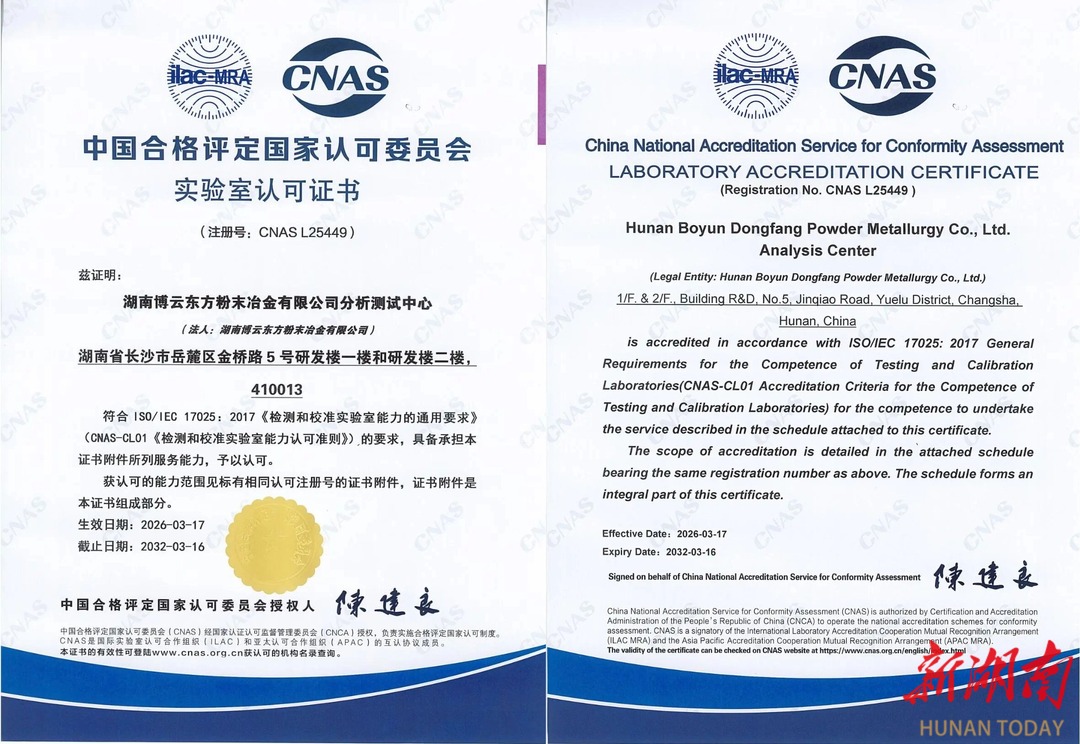 新湖南客户端3月31日讯(通讯员 刘文芳)3月30日,湖南博云东方粉末冶金有限公司(以下简称“博云东方”)分析测试中心正式获得中国合格评定国家认可委员会(CNAS)颁发的实验室认可证书,标志其检测能力和质量管理体系达到国家级及国际级权威标准。