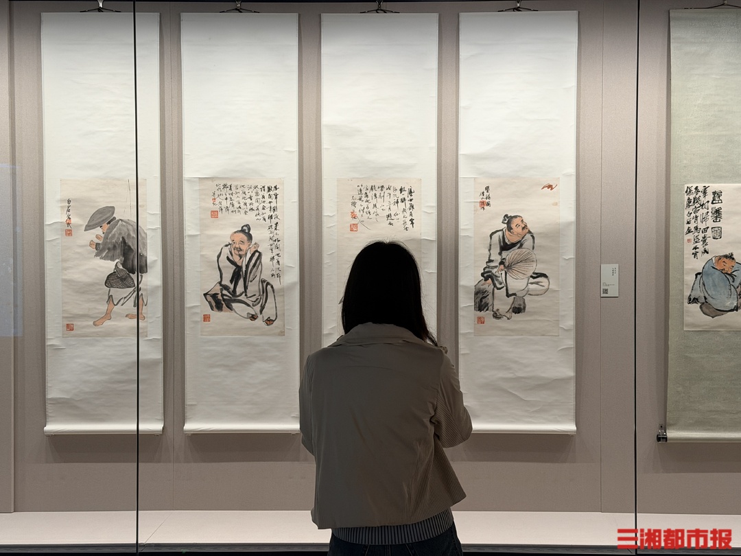“为了更好地兼顾文物保护与展示效果,我们在3月31日对部分展品进行了轮换。”湖南省博物馆馆员陈木垚介绍,此次轮换涉及40件(套)作品,重点值得关注的包括齐白石的《飞瀑图》,以及傅抱石的《二湘图》《屈原像》等。