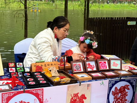 本次非遗集市落户五柳湖西岸,汇聚35个非遗项目集中亮相,湖畔市集人头攒动、热闹非凡。各地游客徜徉桃花林间,赏技艺、看展演、淘好物、享康养,沉浸式邂逅非遗之美。