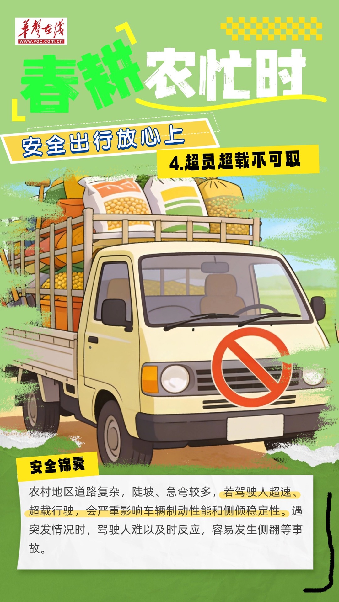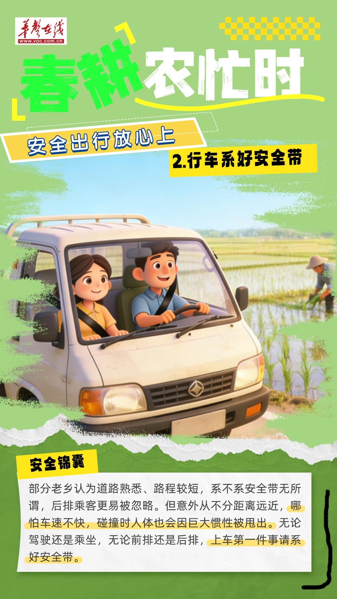 春耕春播,人勤春早。田间地头,老乡们早出晚归,农机车辆穿梭往返,一派繁忙景象。不过,人多、车多了,交通安全风险也跟着上来了。华声在线制作了一份安全提示,为春耕出行搭把手、护平安。
