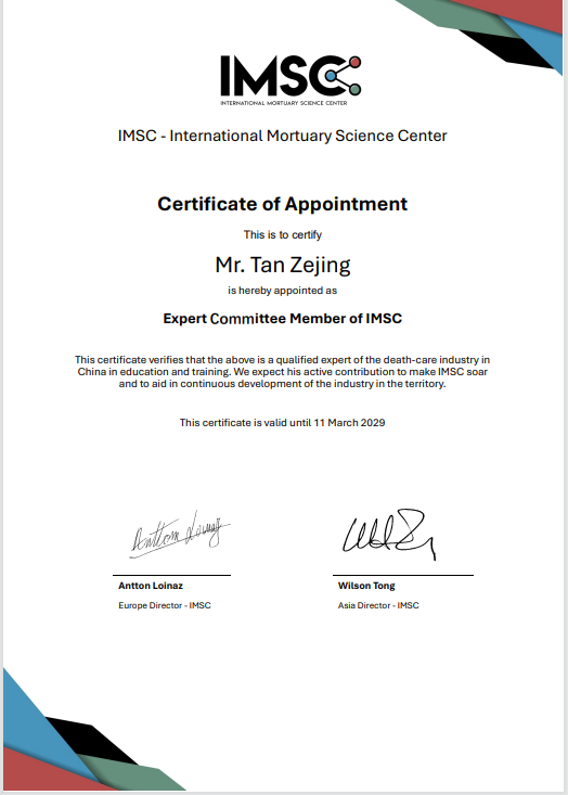 3月11日,谭泽晶被正式任命为IMSC-国际殡葬科学中心专家委员会成员。这一任命是国际殡葬行业对谭泽晶个人专业能力与学术造诣的高度认可,也是对长沙民政职院殡仪专业教育成果的肯定。经过一段时间的流程推进,3月25日,谭泽晶收到了来自 IMSC - 国际殡葬科学中心的正式任命书,标志着长沙民政职院与国际殡葬科学领域的交流与合作迈向了新的台阶。
