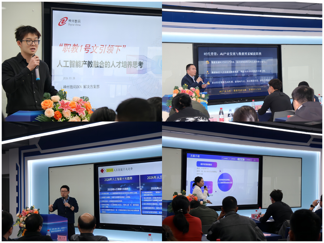 神州数码人工智能解决方案经理冯子普作《职教1号文引领下,人工智能产教融合的人才培养思考》报告,从产业视角解读人工智能产教融合的关键要点,提出构建“资源-教学-评价-管理-AI助教” “五位一体”支撑平台,推动专业建设与产业需求精准对接。神州数码湖南区负责人丁明勇围绕《人工智能时代下产教融合探索》,结合企业实践梳理了产教融合的可行路径与实施策略。湖南邮电职业技术学院AI培训研究院院长张人杰以《人工智能+信息技术赋能教育教学应用实践》为题,系统梳理了DeepSeek、腾讯元宝等20余项AI工具在教学、科研、管理中的实操路径,涵盖提示词技巧、数字人制作、私有知识库搭建等前沿应用。元笃(南京)科技有限公司大区经理丁芬芳作《数字技术赋能资源建设创新实践》报告,分享了AI数字人、智慧课程平台等技术在数字教材与资源建设中的创新探索,为院校打造立体化智慧教学资源提供了可行路径。