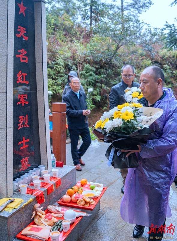 郴州市北湖区仰天湖瑶族乡瑞金村,一座合葬墓前摆满黄菊。墓碑上,“无名红军烈士墓”几个红色大字在雨水中格外醒目。山坡上,两条红底黄字的横幅被雨水打湿,字迹依然清晰——“为先烈寻亲,请英魂回家”。