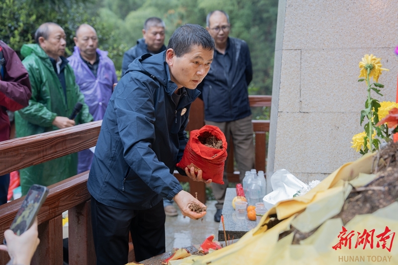 3月31日,郴州市北湖区仰天湖瑶族乡瑞金村,“寻亲代表团”成员将在家乡采集的“出征土”徐徐覆于坟茔,让忠魂重触故土温润。