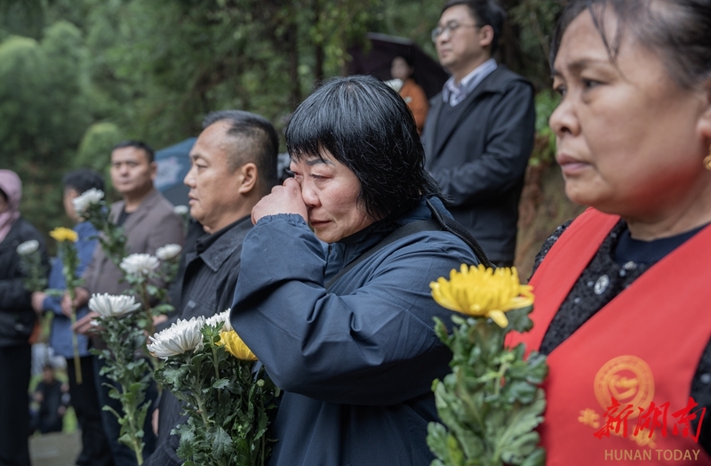 3月31日,郴州市北湖区仰天湖瑶族乡瑞金村,“寻亲代表团”成员在无名红军烈士墓前默哀落泪。
