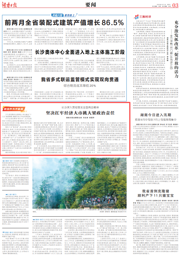 作为全省发展的“排头兵”,长沙迅速将学习贯彻全国两会精神转化为行动自觉,坚决扛牢经济大市挑大梁政治责任,确保全国两会精神落地见效。