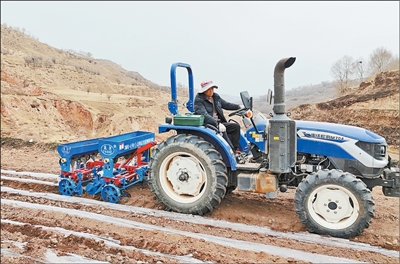 3月下旬,青海省民和回族土族自治县马营镇菜园村山坡上,两台膜侧小麦播种机灵活穿梭,田里铺满规整的地膜垄带。
