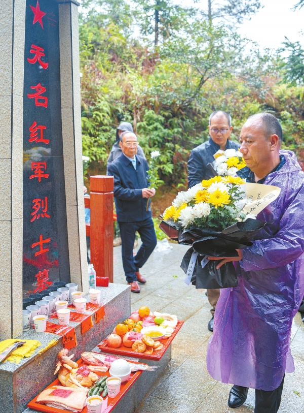 3月31日,郴州市北湖区仰天湖瑶族乡瑞金村,“寻亲代表团”成员向无名红军烈士墓敬献鲜花。