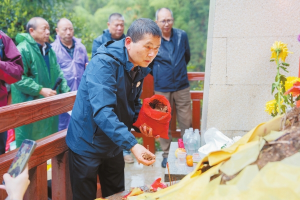 3月31日,郴州市北湖区仰天湖瑶族乡瑞金村,“寻亲代表团”成员将在家乡采集的“出征土”徐徐覆于坟茔,让忠魂重触故土温润。