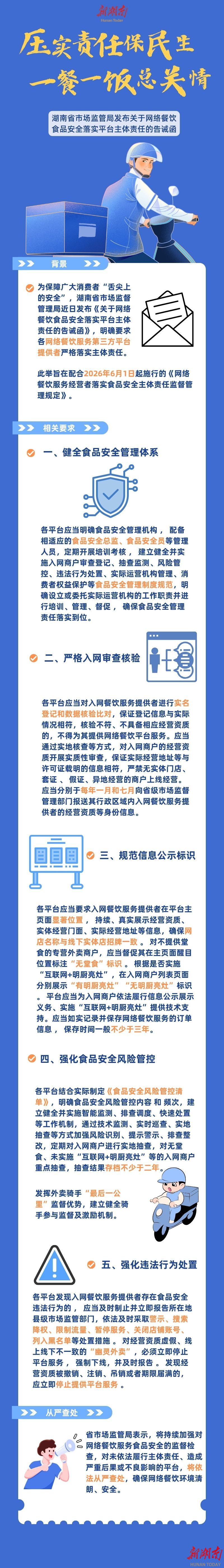 湖南日报4月1日讯(全媒体记者 李成辉 通讯员 杨玉圆 黎迅)《网络餐饮服务经营者落实食品安全主体责任监督管理规定》将自2026年6月1日起施行。省市场监督管理局日前向全省网络餐饮服务第三方平台提供者发布告诫函,围绕管理体系建设、入网资质审查、信息公示标识、食安风险管控、违法行为处置等关键环节提出刚性要求,严格