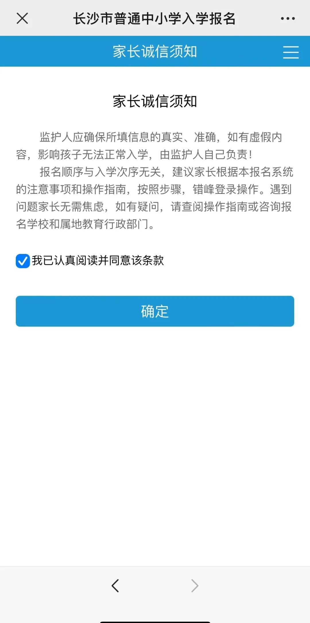 阅读并同意“家长诚信须知”。