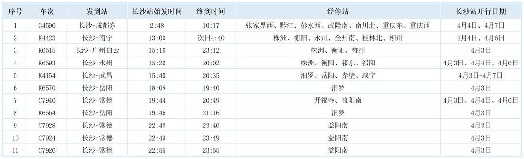 三湘都市报·新湖南客户端4月1日讯(全媒体记者 李致远 通讯员 潘梦冉 孙玉婷)4月1日,记者从长沙火车站获悉,为满足2026年清明假期广大旅客踏青、探亲、旅游出行需求,长沙火车站计划新增始发临客列车11列,覆盖成都、武昌、广州、南宁、常德、永州、岳阳等热门方向。其中新增夜间高铁4列,长沙至成都东1列、长沙至常德3列,助力旅客顺利出行。